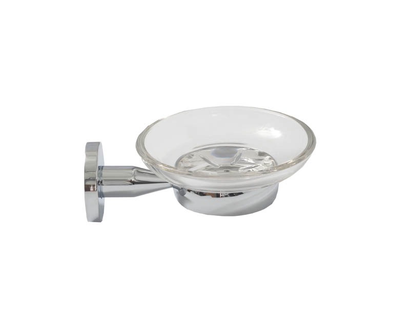 Texto para Prescripción: JABONERA DE CRISTAL MARCA JAMI REF. AB215LTC1, DE LATÓN CROMADO CON SISTEMA ANTIGIRO. DIMENSIONES: 110X50X138 MM Y SOPORTE Ø109 MM